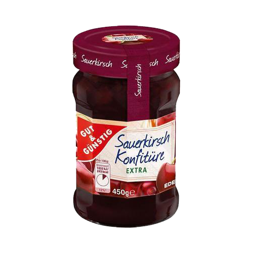 Excellent cherry jam with a high fruit content that is definitely worth trying. It is great on fresh bread as well as on freshly baked gingerbread or other pastries. It contains bits of fruit.